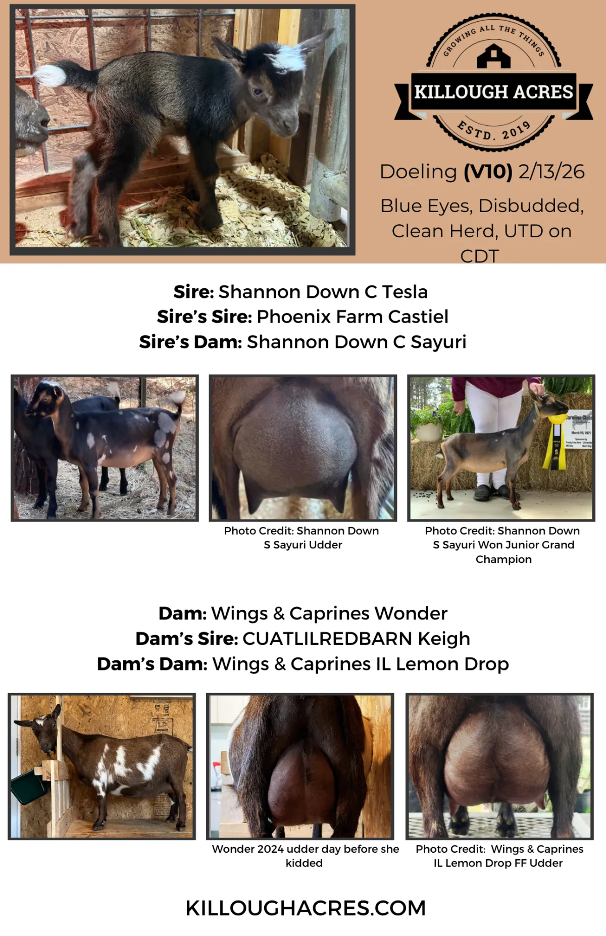 Goat kids will be disbudded, tattooed (if size is appropriate), given coccidia prevention, and vaccinated twice for CD/T (timeline depending). For goat kids (bottle babies) picked up before 12 weeks old, buyer is responsible for CD/T vaccinations or boosters.